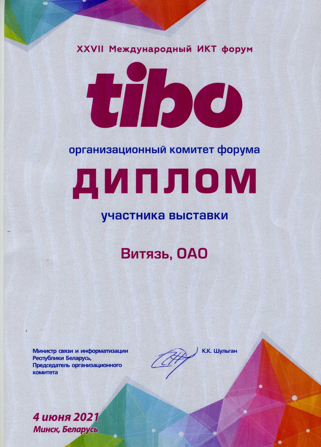 Диплом участника выставки "tibo"