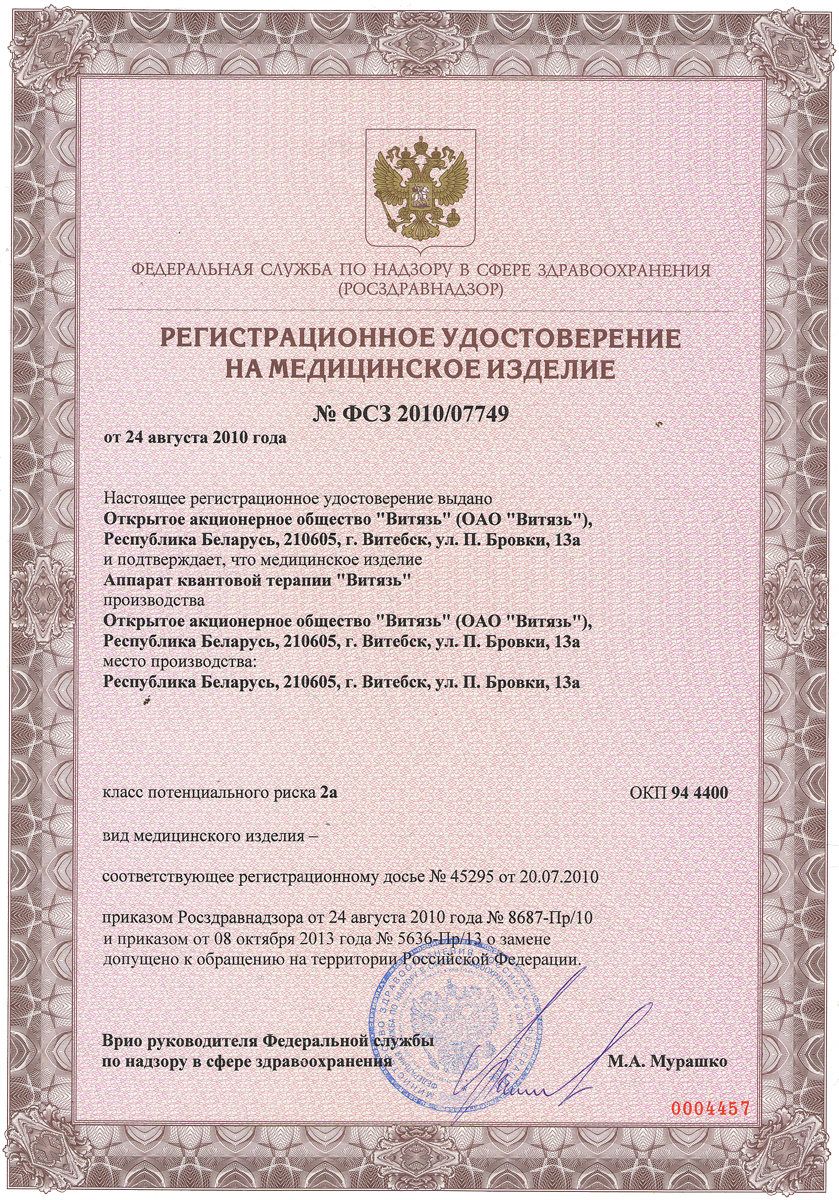 Аппарат квантовой терапии "Витязь" с комплектом насадок и защитными очками предназначен для безболезненного лечения широкого спектра заболеваний методом воздействия на ткани, клетки, точки акупунктуры организма магнитным и электромагнитными полями квантового излучения видимого красного 650 нм и инфракрасного 850 нм диапазона волн.