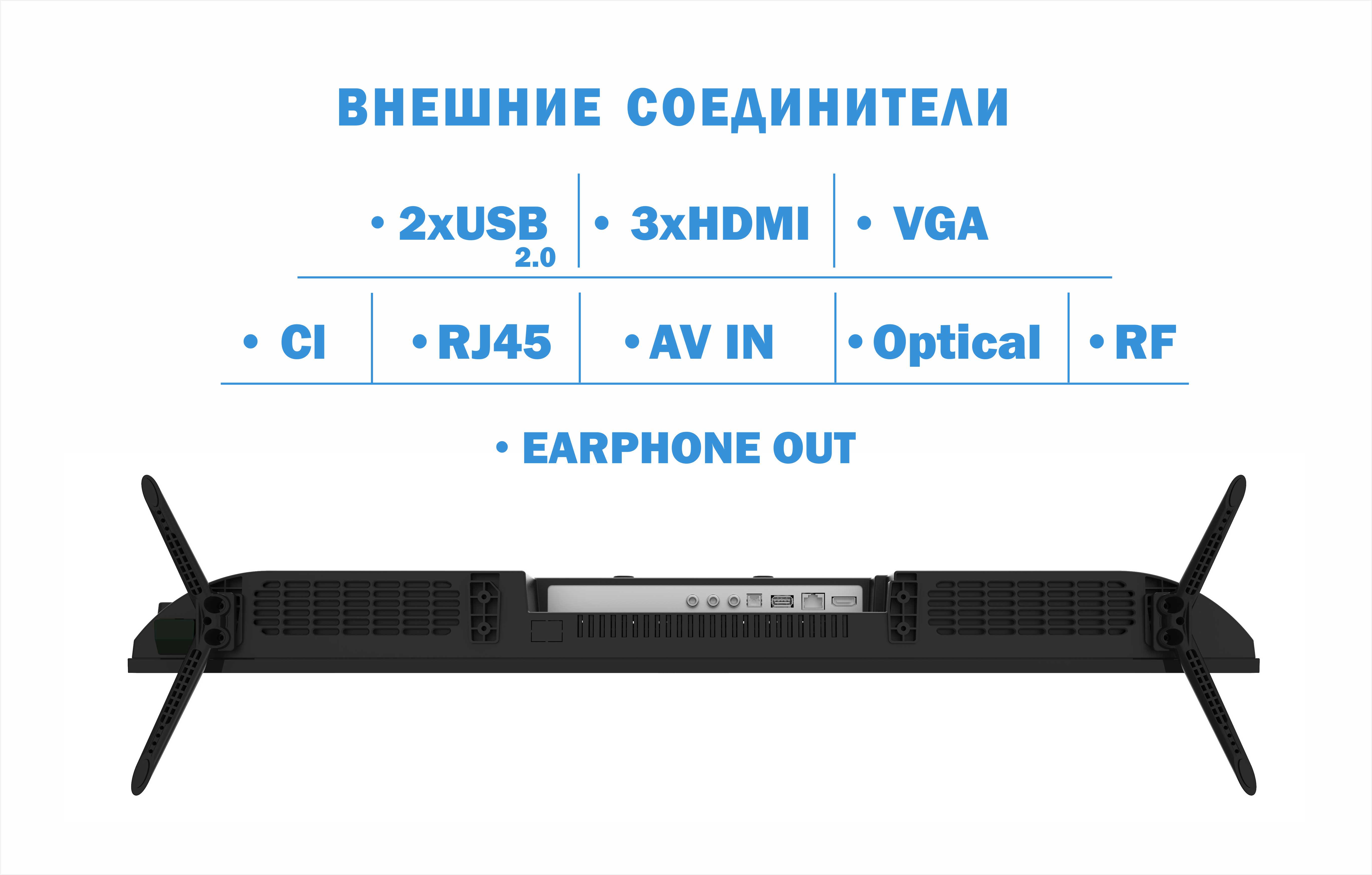 HDMI*3, RJ45*1, (RCA)AV IN*1, Optical*1, RF IN*2, USB*2, EARPHONE OUT*1, CI
