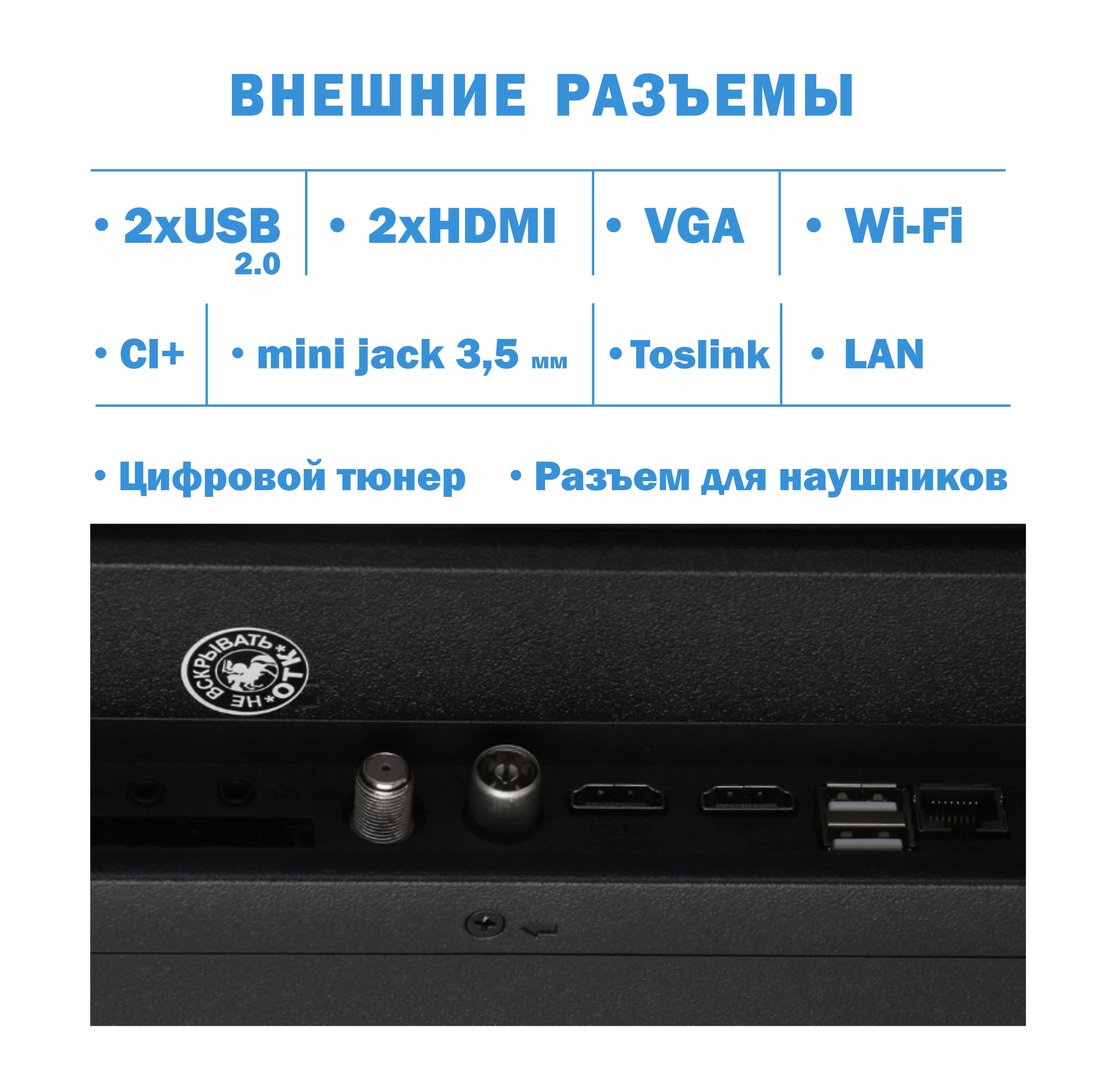 Защита от детей гарантирует безопасную эксплуатацию, ограничивая доступ к ряду опций. Для подключения к сторонней технике задействуются интерфейсы Wi-Fi, LAN, Toslink, RCA, 3,5 мм, два порта USB 2.0 типа А и два — HDMI версии 1.2. Прибор оснащен тюнером DVB T/T2/C/S/S2. Источником питания служит стандартная электросеть напряжением 220 В. Устройство потребляет 68 Вт. За звуковое сопровождение отвечают два динамика Dolby Digital Plus по 8 Вт.